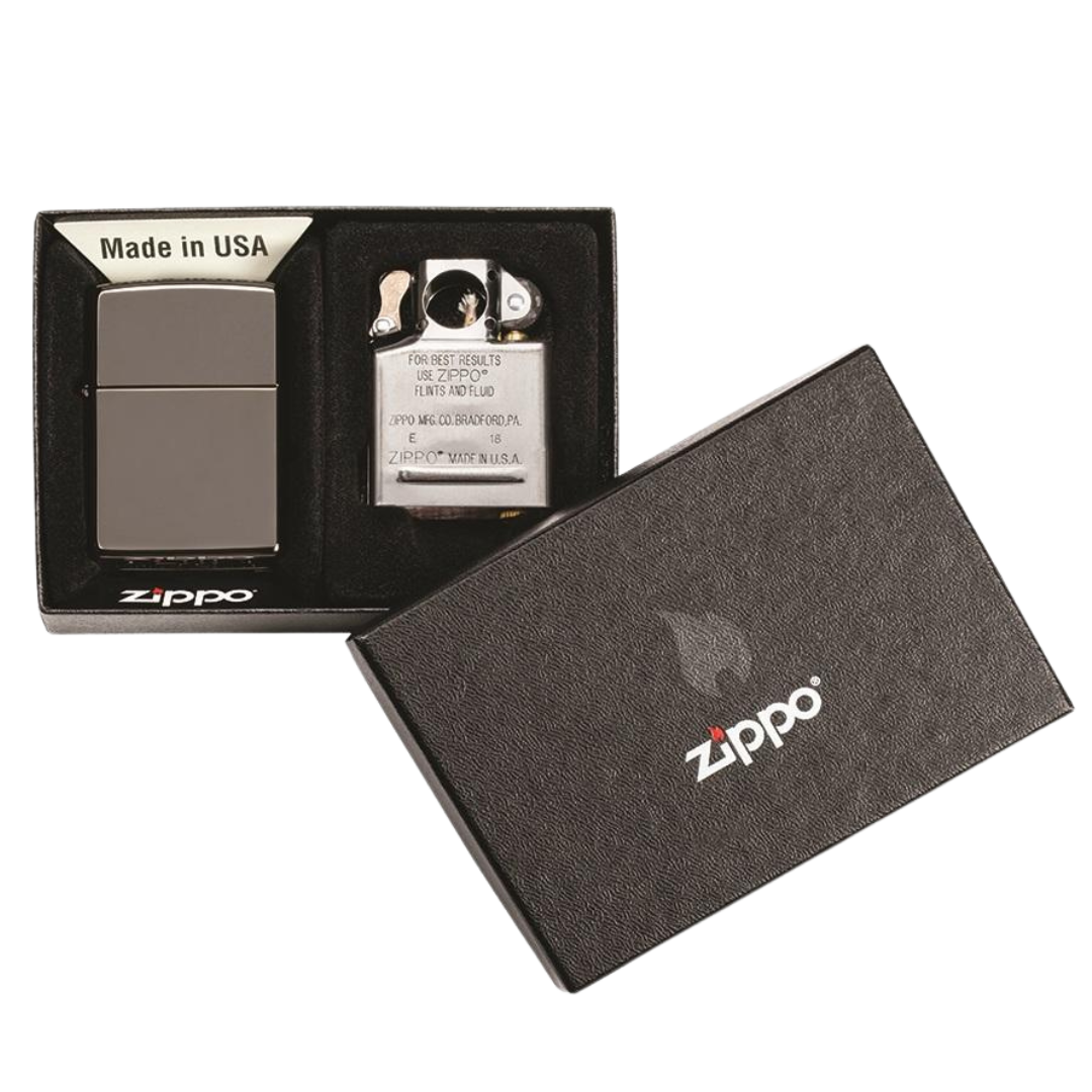 For the first time ever, and at the request of countless consumers, Zippo offers the popular Black Ice® classic lighter in a gift set that includes both the standard and pipe inserts for ultimate functionality. Comes packaged in a gift box. For optimal performance, fill with Zippo lighter fuel.