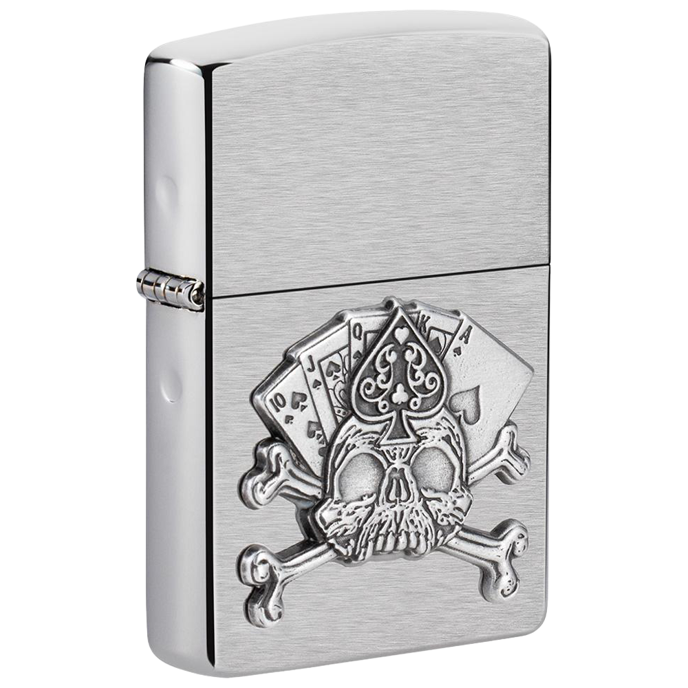 The Royal Flush is the most sought after hand in poker. However, few ever see it with their own eyes. Fashioned to a Brush Chrome lighter is an emblem that features that improbable poker hand, a spade, above a skull and crossbones. Comes packaged in a gift box. For optimal performance, fill with Zippo lighter fuel.