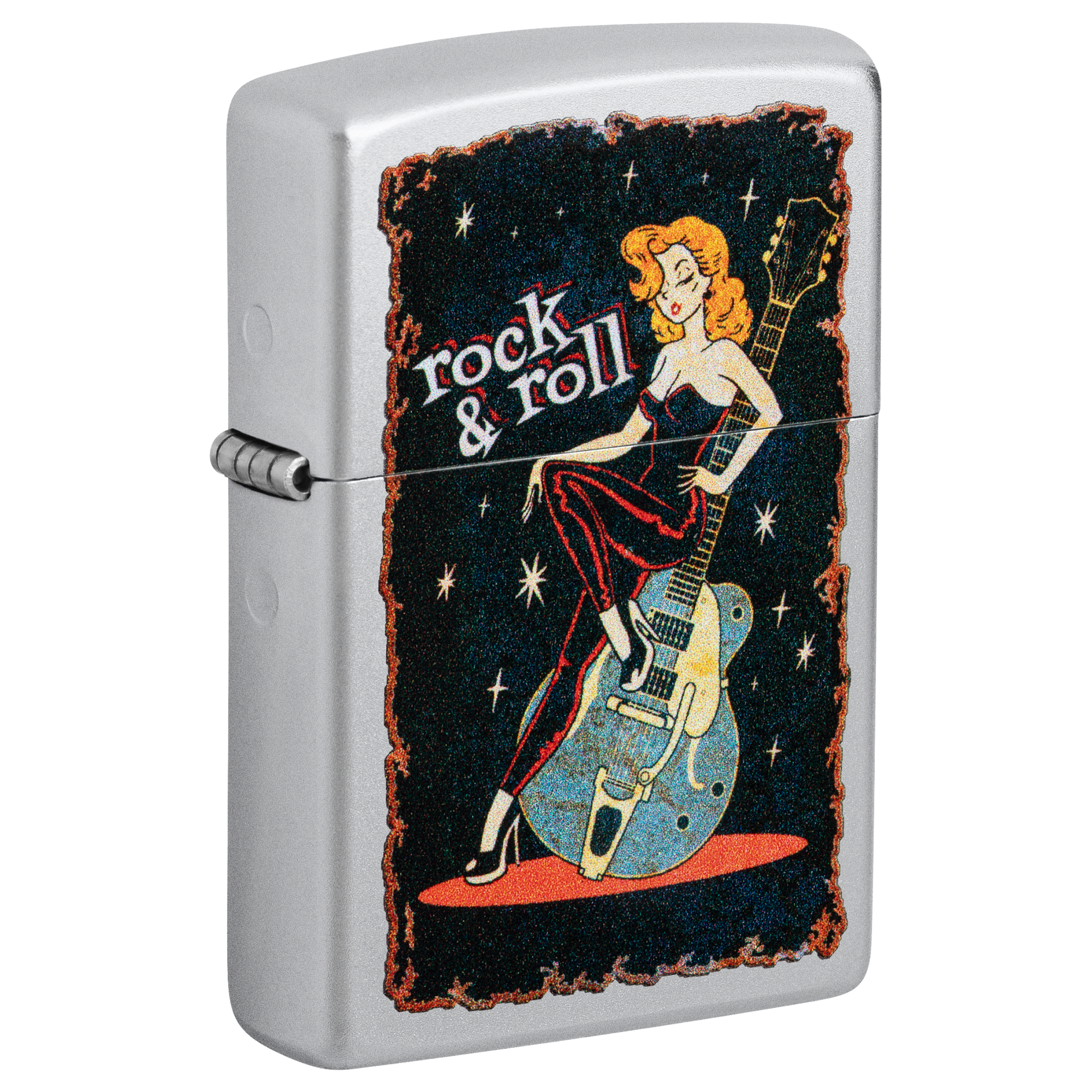 A vintage-inspired pinup model relaxes on an oversized guitar on this Satin Chrome lighter in a classic Color Image design. Comes packaged in a gift box. For optimal performance fill with Zippo lighter fuel.