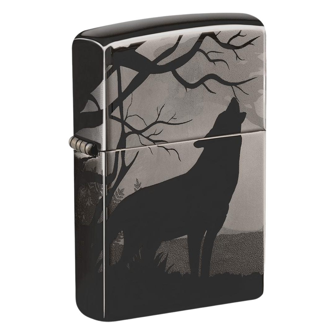 Whether you're a lone wolf or a part of a pack, this new wolf lighter is bound to satisfy that need. In this stunning scene, you'll find a silhouette of a wolf, howling into the night, deep in a shadowy forest. Rotate the lighter to find another wolf standing guard on the back. This image seamlessly circumnavigates the entirety of a Black Ice® lighter's surface using the Photo Image 360° process. Comes packaged in a gift box. For optimal performance, fill with Zippo lighter fuel.